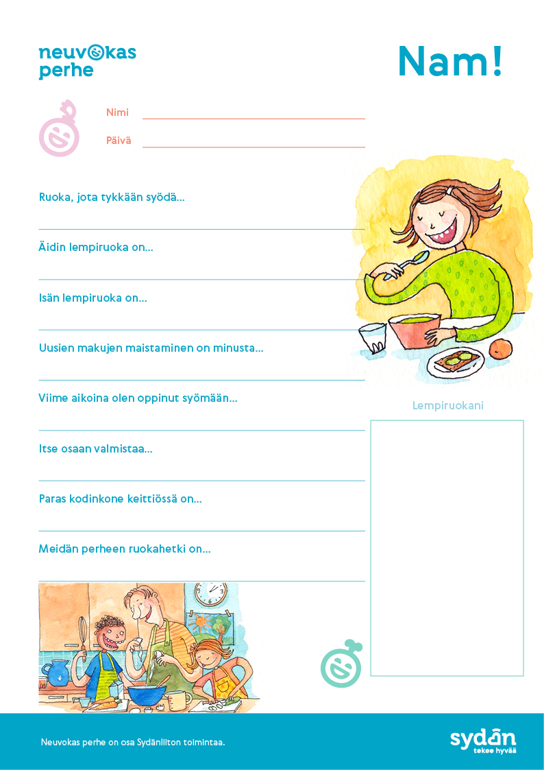 Nam! -sivun tarkoituksena on, että lapsi voi kertoa oman näkemyksensä syömisestä. Sivun voi pienemmän lapsen kanssa täyttää myös haastattelemalla.